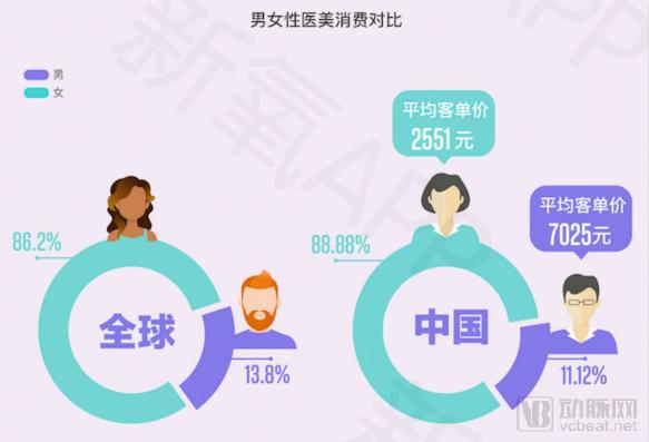 虽然男性数量少,但是他们更愿意倾囊投入。根据新氧大数据,男性医美消费者的平均客单价为7025元,女性为2551元,男性平均每单的花费是女性的2.75倍。