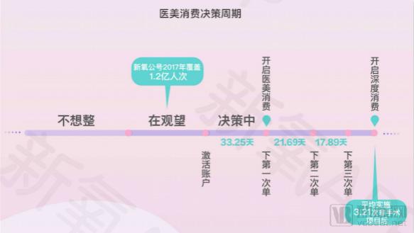 医美消费第一单前需要突破强大的心理障碍。根据新氧大数据,新氧用户从激活新氧APP帐户到下第一单的平均周期33.25天,复购决策加快。新氧APP上累积了380万篇消费者亲自撰写的整形日记,并与7000余家正规医美机构和25814名有执业资格的医生相关联,基本覆盖了中国正规医美市场服务提供商。吸引了大量潜在消费者查看。