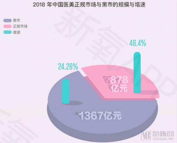 2018年中国医美正规市场规模或达878亿元,同比增速46.4%,共有近万家正规医美机构提供服务。中国医美黑市规模或达1367亿元,同比增速24.26%,共有超过10万家非法执业的工作室、美容院等机构。