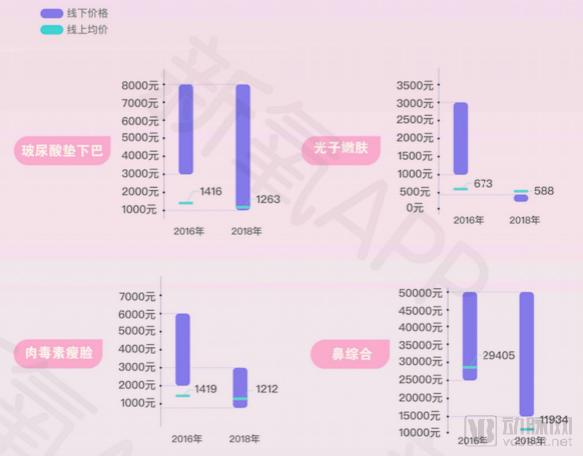 2018年,新氧调取了后台近400个项目近3年的交易价格,得到医美项目的线上均价。然后走访了138家医美机构,得到医美项目的线下主要价格范围。统计后发现,近三年医美项目线上均价平均下降了29%。价格下降的原因主要是因为医美APP让交易更透明、公开,消费者对于抗衰和手术类项目越来越注重品质和效果。