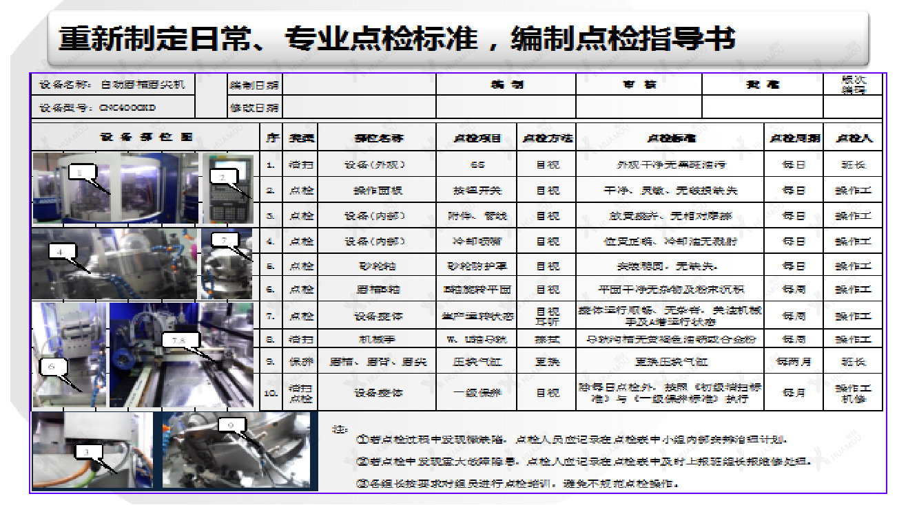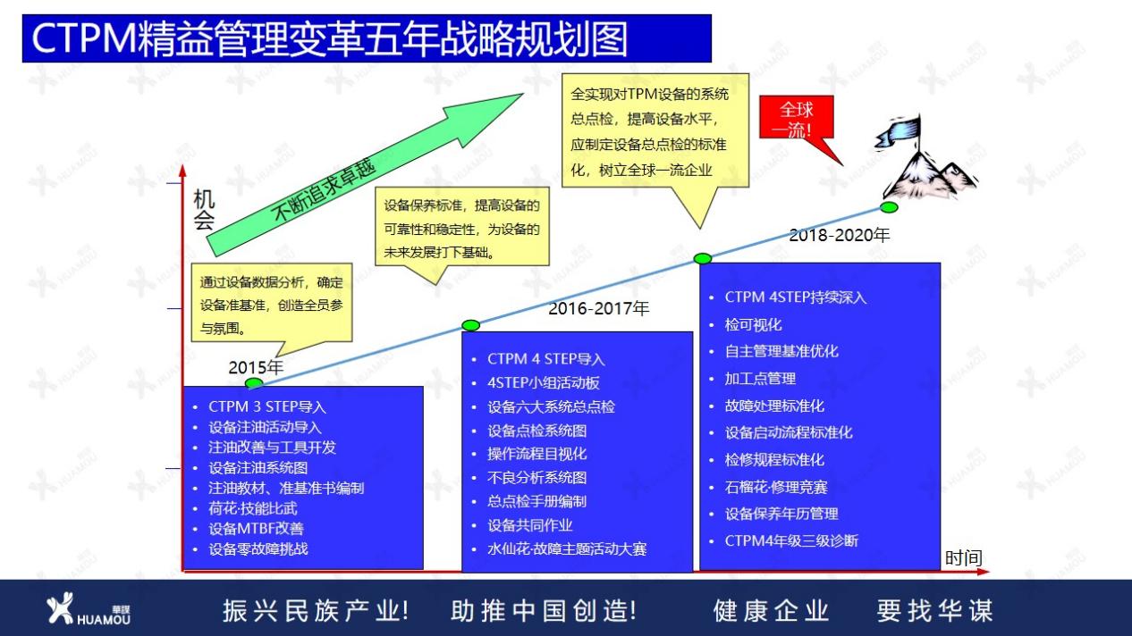2015年度导入CTPM 4 STEP,人员方面:学习设备结构、功能、正常基准,掌握点检技能,提升异常发现能力。设备方面:复原关键部位劣化不合理,提高稳定性。彻底进行点检困难部位改善及目视管理,使设备点检更加容易,建立每台设备管理履历,设备预防保全、改良保全能力进一步提升,精益方面看板拉动、OEE成果扩大化。