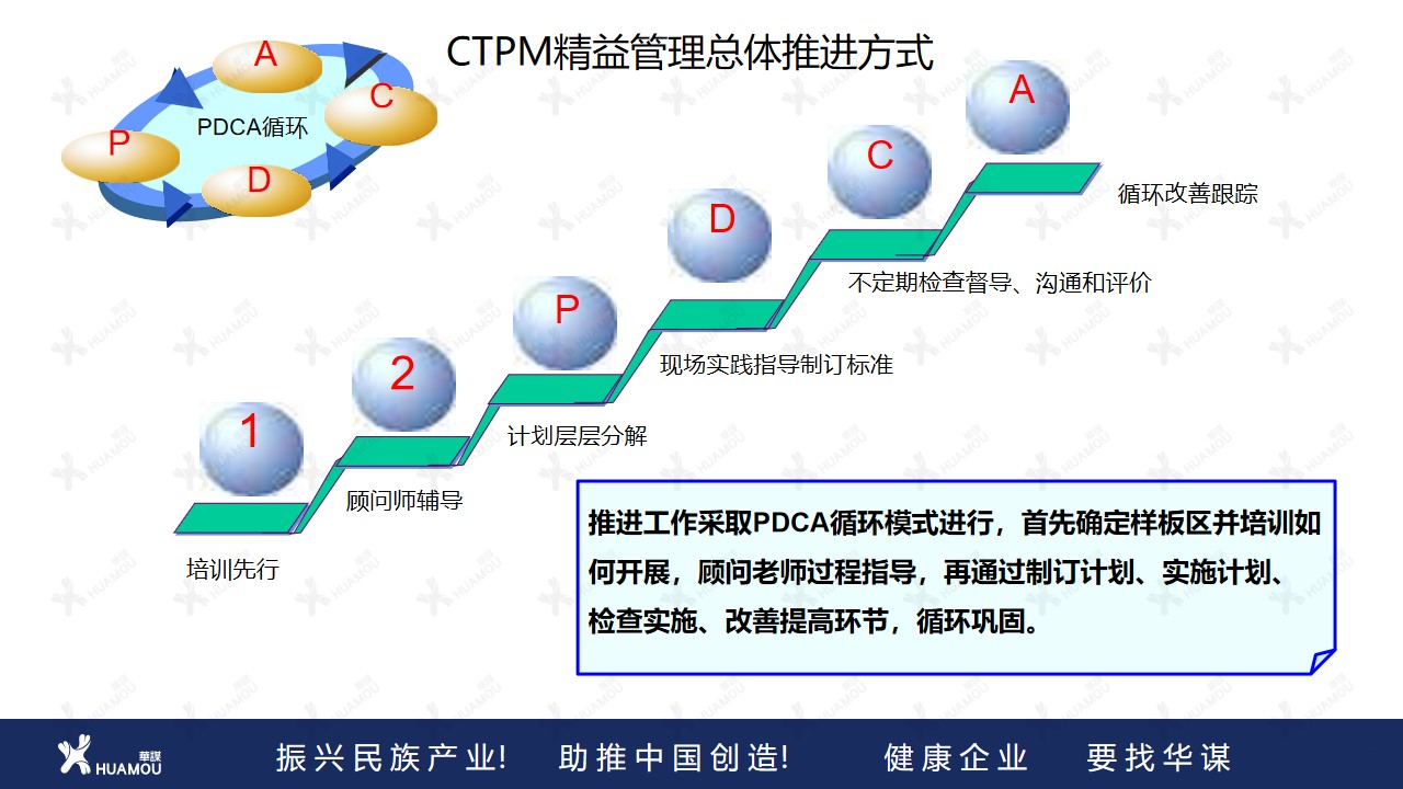 CTPM精益管理推进工作采取PDCA循环模式进行,首先确定样板区并培训如何开展,顾问公司老师过程指导,再通过制订计划、实施计划、检查实施、改善提高跟踪环节,循环巩固。