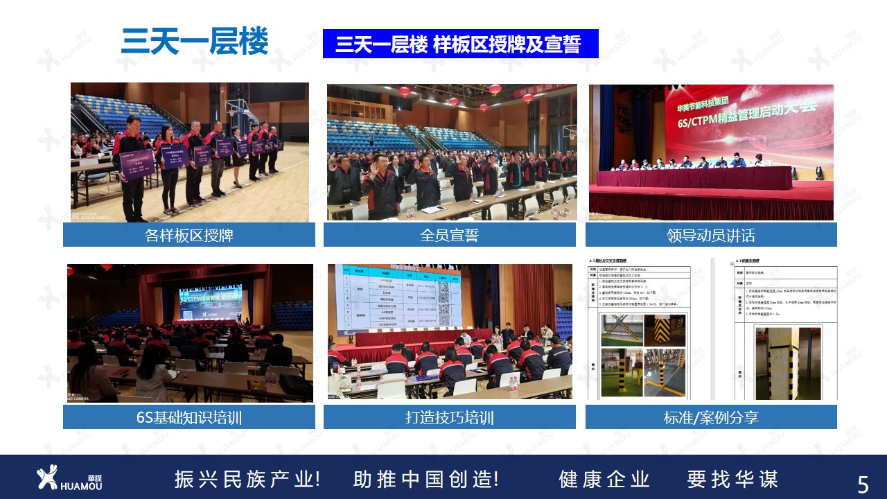 2011年10月18日黄巍总经理带领公司各部门领导参与了CTPM管理推进正式启动会,黄巍总经理向8个样板区第一责任人颁发了样板单位标示牌,宣布CTPM精益管理活动正式开始。期间华天谋顾问机构岳华新总裁对于如何作好现场管理做了动员,顾问老师对CTPM基础及6S知识进行培训。三天一层楼样板区的建设成功确保CTPM精益管理开了好局,也为后续导入各项模块奠定了基础。