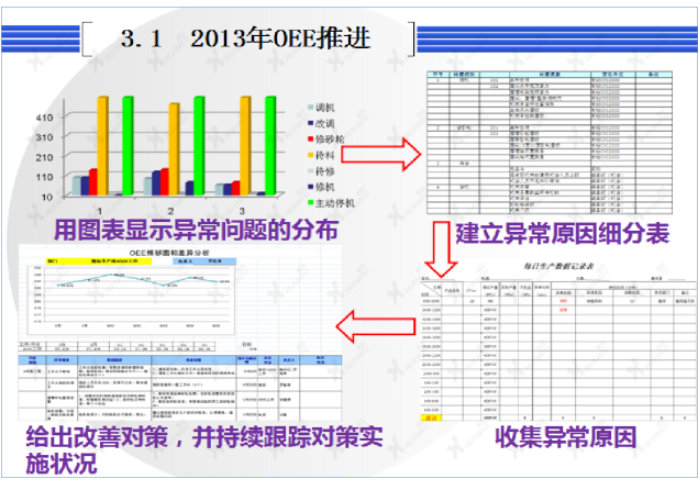 2013年度继续开展CTPM 2 STEP,导入WHY—WHY分析循环改善、看板拉动、OEE落实到实处,建立标准化作业,精益管理方面开展了八大浪费改善活动。