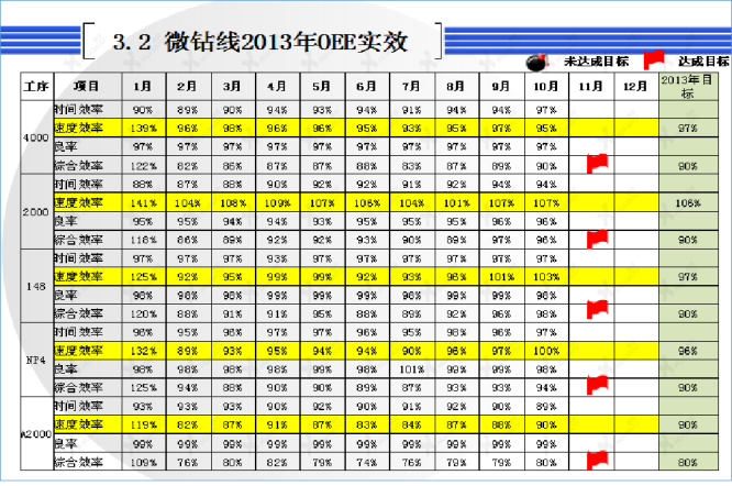 2014年共收到6213条提案,评选出重点提案253个,为公司创造预期收益378万元;通过why-why分析改善、循环改善,为员工提高解决问题思路。共对126个两源进行分析及改善;通过八大浪费的学习、发现及改善,共解决114处浪费点;微钻线OEE改善实现了全部达标的优异成绩,主题活动开展19个,效果金额179万元。