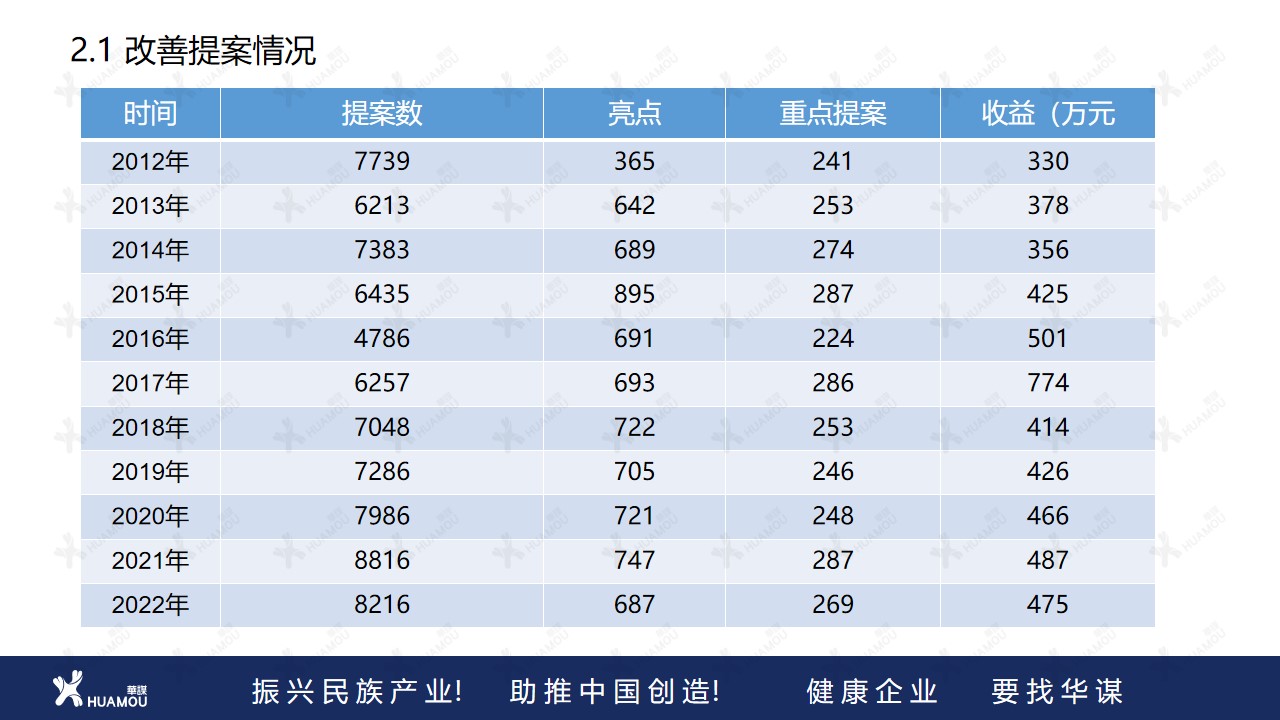 2021年共收到8816条提案,评选出重点提案287个,为公司创造预期收益487万元。主题活动开展21个,效果金额287万元,编制完成SQM标准遵守书、QC工程图,梳理CTPM各类教材32份。