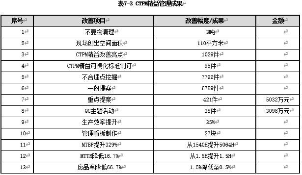 CTPM精益管理涉及到生产现场的材料、物品、设备、环境、安全、管理方式等内容,通过将改善机制和激励机制的建立,形成了全员参与的改善氛围;通过将优秀改善提案、主题在现场CTPM看板中的展示;通过组织改善亮点分布的实施;通过现场改善提案工作的开展对现场改善工作进行宣传,建立了全员自主创新平台的连接渠道,有效地推进了全员自主创新体系的建设。