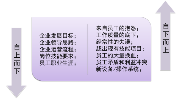 培训需求的来源主要有两个方面:一是自上而下的需求。主要为公司的发展战略要求决定员工应该学习什么,应该具备什么,这样才能够让员工跟着企业的发展方向前进。二是从下而上的需求。在公司发展执行过程中,有很多基础的问题产生,有的是认知问题,有的是不具备条件,有的是大换血等,这就需要我们快速给员工补充知识,从而产生培训需求。具体如图3-3所示。
