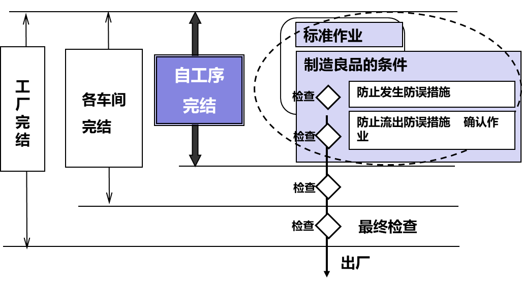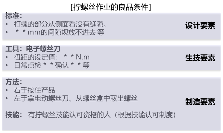 按照图纸要求做就能制造出良品 作业完成后能够判断合格与否 | 配备了能够判断合格与否的设备和工夹具 规定了能生产良品的技术工艺要求 | 作业方法、动作要素都有明确的规定(谁、什么时候、做什么、怎样做) |