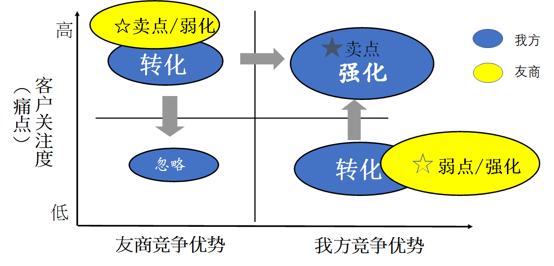 与友商竞争对比分析,包括宏观和微观。宏观力量短时间无法改变,微观对比是可以被销售所改变的。宏观竞争分析有三个点:你的卖点、客户的关注点和痛点、友商的弱点。我方的卖点要强化和转化;友商的卖点要弱化,弱点要强化,如图6-1所示。