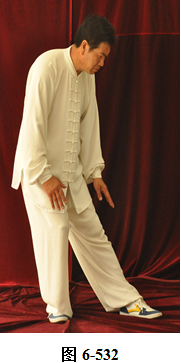 左云手:接上式,腰微拱,向左旋转。左脚以脚跟为轴向外转脚尖,脚尖转向东南。右脚以脚跟为轴向里转脚尖,脚尖转向东南。身体转向面朝东南;腰随即后拱,呈后倚坐式,重心落于右腿。左手随身转下摆至左胯侧旁,右手随拱腰下摆落于右腿侧旁,上身微俯;腰上提走弧形,右手经腹前向左前下穿掌,掌心向左,随穿掌重心移于左腿(见图6-540至6-543)。腰上提身体直立,右脚随身体直立向左脚并拢。右掌抽回胸前高与乳平,掌心向里。左手弧形回至腹前,掌心向里。右手在上,左手在下,两臂圆撑,脊背后倚。