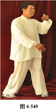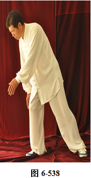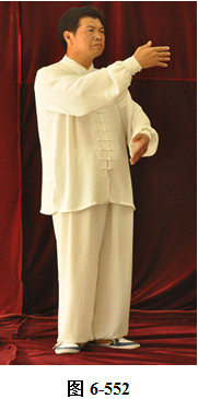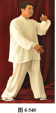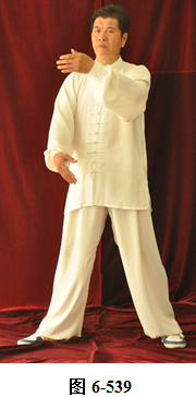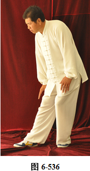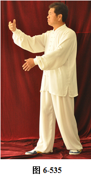 右云手:腰微含,向右外转,右脚以脚跟为轴,往右外转脚尖。左脚以脚尖为轴,往左外转脚跟。身体随腰右转面朝向西南方向; 腰向后拱,重心落于左腿,呈下倚坐式。右手随腰后拱,右下划弧摆至右侧胯旁。左手下划弧落于左腿侧旁;腰上提走弧形,左掌随腰向上走弧形,向右前穿掌,重心落于右腿上;腰微提,左脚跟随提起,向左顺开一步,掌心向右,上身微俯。腰上提身体直立,左掌抽回胸前高与乳平,掌心向里。右手弧形拉回至腹前,掌心向里。左手在上,右手在下,两臂圆撑,脊背后倚 (见图6-535至6-539)。
