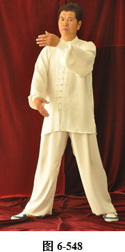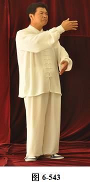右云手:接上式,腰微含向右外转, 右脚以脚跟为轴往右外转脚尖。左脚以脚尖为轴往左外转脚跟,身体随腰右转,面向西南;腰向后拱,重心落于左腿,成下倚坐式。右手随腰后拱,右下摆至右胯侧旁。左手落于左腿侧旁;腰上提走弧形,左掌随腰向右前穿掌,重心落于右腿上。腰微提,左脚随腰提向左顺开一步,掌心向右,上身微俯(见图6-544至6-548)。腰上提身体直立,左掌抽回胸前,高与乳平,掌心向里。右手弧形回至腹前,掌心向里。左手在上, 右手在下,两臂圆撑,脊背后倚。