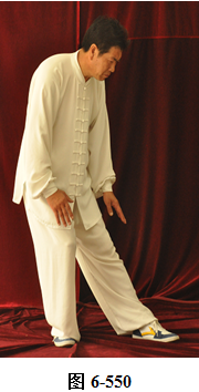 左云手:接上式,腰微拱向左旋转,左脚以脚跟为轴向外转脚尖,右脚以右脚跟为轴向里转脚尖;腰随即后拱,成后倚坐式。左手随腰转下划摆至左胯侧旁,右手随拱腰下摆落于右腿侧旁;腰上提走弧形,右手经腹前向左下穿掌,掌心向左。上身微俯,随穿掌重心移于前腿(见图6-549至6-552)。腰上提身体直立,右脚随身体直立向左脚并拢。右掌抽回胸前,高与乳平,掌心向里。左手弧形回拉至腹前,掌心向里。右手在上,左手在下,两臂圆撑,脊背后倚。