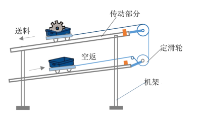 这个装置由重力物体、两个斜面和两个定滑轮构成。其作用主要是实现送料和空箱返回,整个过程不依赖外部电源或压缩空气等动力源,是低碳环保的设计。它利用物体在斜面上的重力下滑来完成送料,当物料被取走后,塑料空箱依靠斜面自动返回。在设计时,为避免空箱滑动速度过快,通过增加斜面摩擦力的方式,控制其运动速度,让空箱缓慢返回。该装置一台设备可实现两个动作,减少了作业人员来回走动,既实现送料至作业者身旁,又能自动完成空箱返回,达到省时省力的效果。
