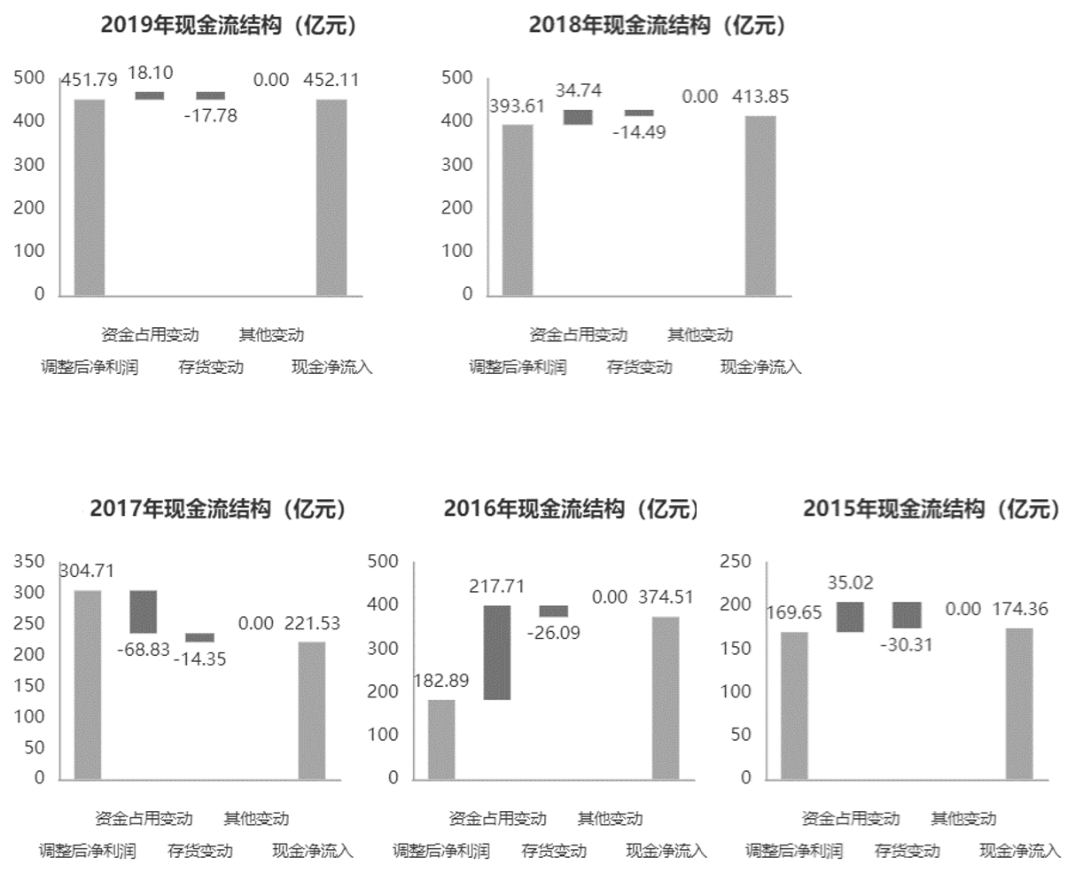 具体来看,我们将所有影响经营活动现金流量的项目分为四类:调整后净利润、资金占用变动、存货变动和其他变动。其中,调整后净利润反映公司折旧摊销前经营性净利润,是公司长期稳定的经营活动现金流的基础,体现公司的盈利能力;资金占用变动反映公司应收应付项变动导致的现金净流入,体现公司的议价能力;存货变动反映公司存货变动导致的现金净流入,体现公司的存货管理。