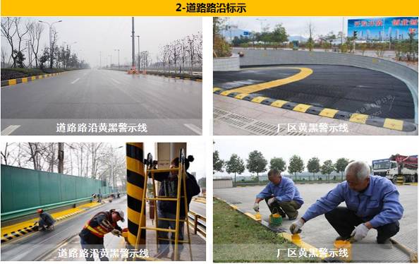 黄黑油漆间隔,根据道路长度,可规划10~100cm一节或一个路沿为分割线。