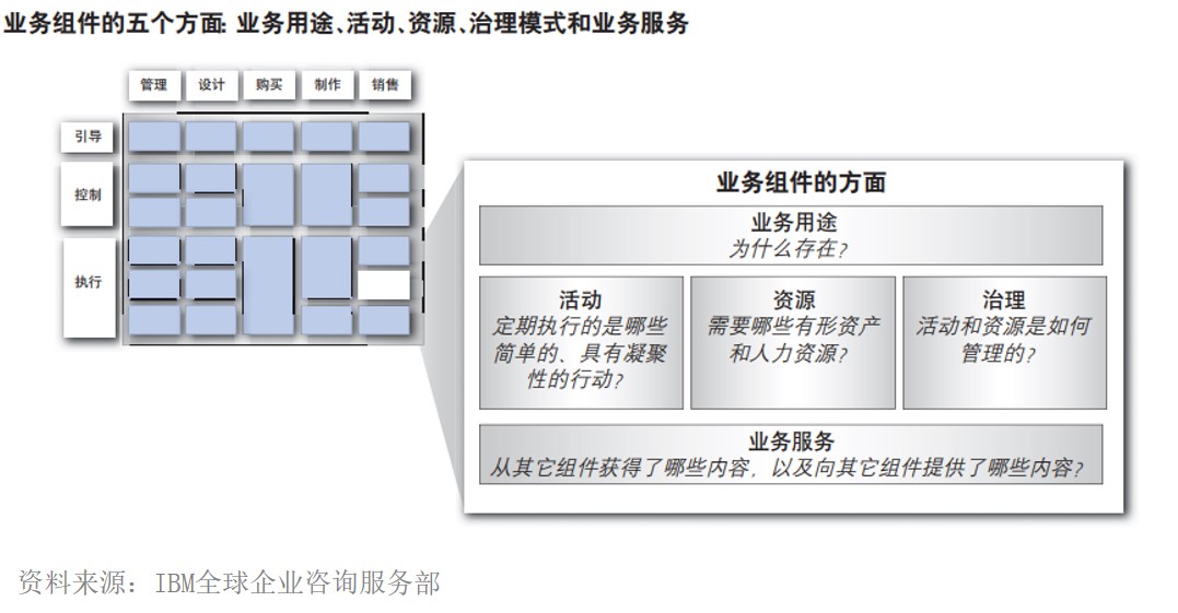 组件化业务模型(CBM)将公司业务分解为一系列的业务组件,并按照业务能力和责任级别将所有的业务组件进行组合排列,形成业务的全局视图。如下图所示: