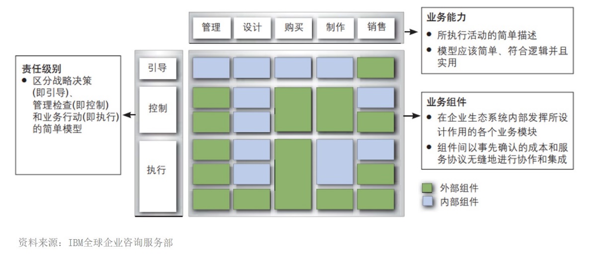 组件可将各种业务活动汇总起来,形成多个独立的模块,并在公司之间共享。组件化业务模型(CBM)可按照业务能力和责任级别两个维度对组件进行组织,通过这一模型,管理人员就可以设想当前的业务活动是如何通过一系列相互联系的模块运行实施的。如下图所示:
