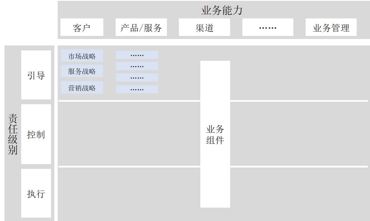 上图中,中间主体部分的业务组件,根据公司的实际业务进行填充,与业务能力及责任级别关联起来。