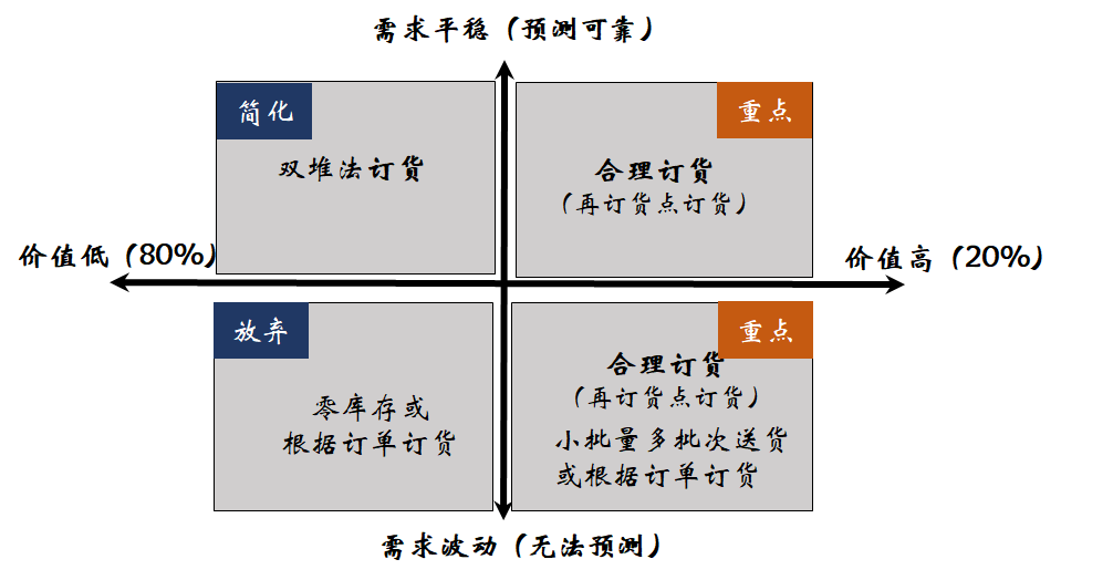 为了简化问题,以价值和需求形成四个象限:价值高(金额占到80%)需求平稳、价值高(金额占到80%)需求波动、价值低(金额占到20%)需求平稳、价值低(金额占到20%)需求波动,所有库存的产品位于四个象限中的某个象限,库存管理就可以形成有针对性的对策。