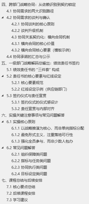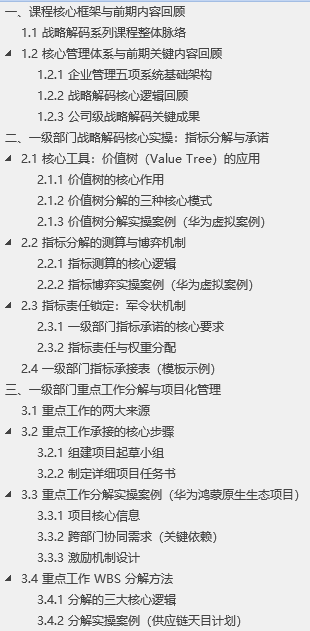 本系列课程聚焦 “从战略设计到战略解码”,共 8 讲内容,本次为第 7 讲,核心聚焦一级部门战略拉通实操。系列课程遵循 “从宏观到微观、从理论到落地” 的逻辑,此前已完成公司级战略解码(明确战略方向与意图、推演出 CSF 关键成功要素、确定公司重点工作、导出战略衡量指标),后续将推进部门级战略解码与个人 PVC 闭环。