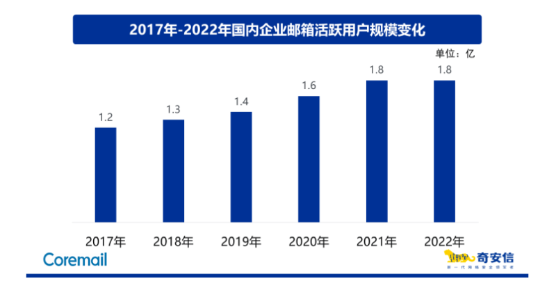 根据 Coremail邮件安全人工智能实验室与奇安信行业安全研究中心的联合监测,综合网易、腾讯、阿里巴巴等主流企业邮箱服务提供商的公开数据进行分析评估,截止2022 年,国内注册的企业邮箱独立域名约为 537 万个,相比 2021 年增加 0.4%。活跃的国内企业 邮箱用户规模约为 1.8 亿,与 2021 年用户规模相比基本持平。