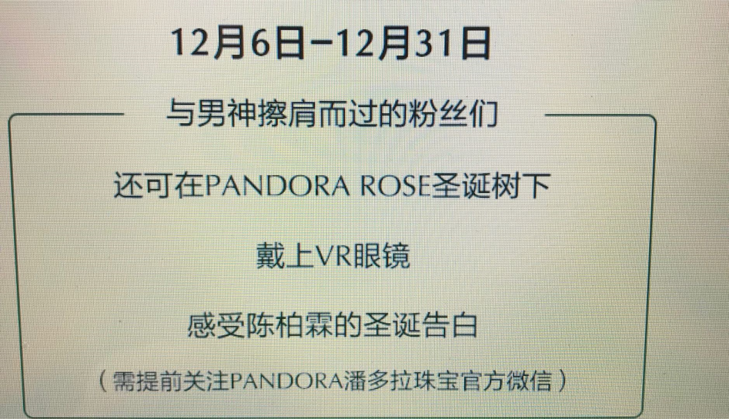 2017年圣诞节,潘多拉珠宝就在上海的K11店铺设置了一棵大圣诞树,消费者可以借助VR眼镜来体验“刚刚,陈柏霖跟我告白了”的视频。视频中的男神就是羞涩的小男生,为了向心爱的女孩告白,在女孩家门前反复练习各种告白的场景。当女孩突然打开门的一瞬间,男神为了化解尴尬,立即拿出潘多拉首饰盒示爱。沉浸式体验让女粉丝尖叫不已。如图6-3所示。