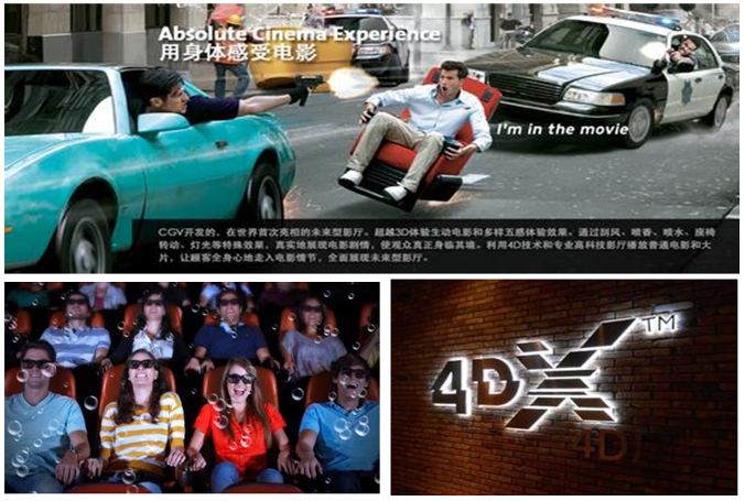 4D厅与以往坐落于各类游乐场、科技馆的体验型4D影院不同。4D厅摈弃了传统的教育、科技体验的短片。观影过程中,观众可以同步体验根据片中剧情设置的座椅转动、吹风、喷香味、喷水、闪电等颇具实感性的特殊效果,从视觉、听觉、触觉、嗅觉四个维度全方位进行观影体验,具体如图2-5、图2-6所示。