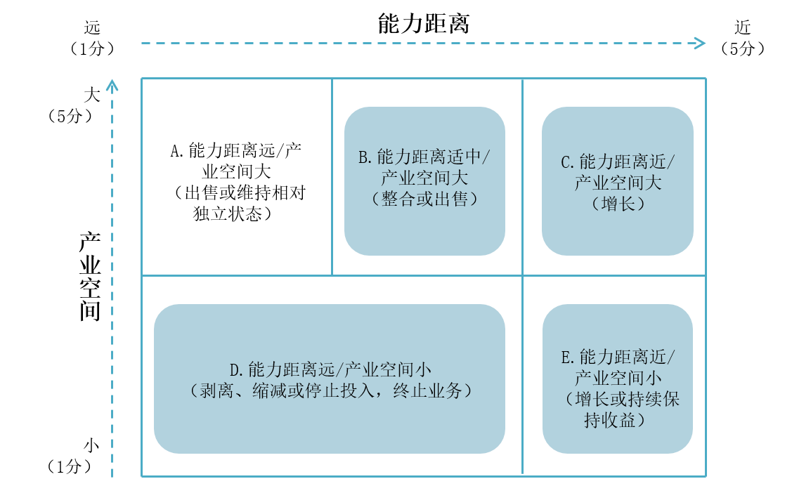 根据对各个业务“产业空间”和“能力距离”的评分,可以确立各个业务的组合策略(如图10-6所示),如图10-6所示。