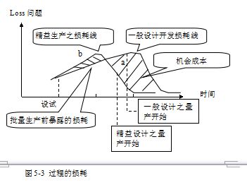 缩短设计到批量生产的时间。如图5-3所示。其中阴影部分a与阴影b之差就是精益生产比一般生产之设计开发到量产阶段的损耗的降低部分,此部分被称之为机会成本。为什么称机会成本,因为精益生产方式比一般生产方式进入批量生产的时间快,同时损耗又少,这就创造了更多机会获取更高的利润。