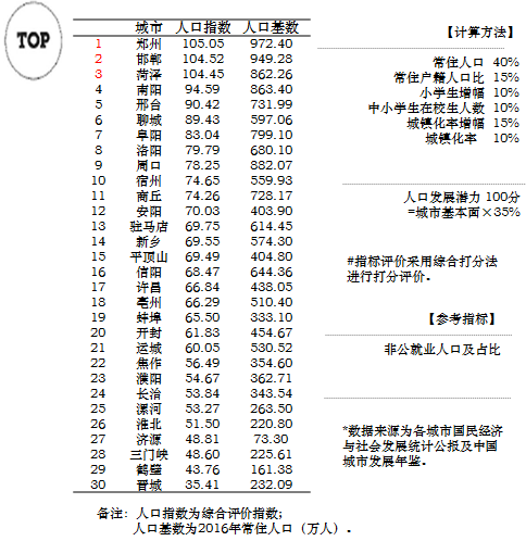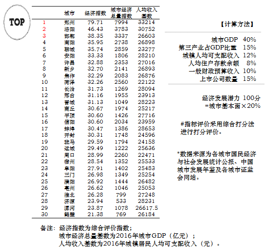 中原城市群城市基本面综合排名TOP3的城市为:郑州、邯郸、菏泽。处在城市发展较好区、适中区、较差区的城市个数比为1:14:15。