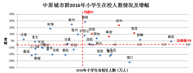 从小学生2016年在校生人数看,中原城市群2016年小学生在校人数为1555万人,占全国小学生在校人数9913万人的15.7%,高于城市群占全国总人口比重11.84%的水平;中原城市群30个城市小学生在校生人数总涨幅为-5%; 重点关注城市郑州、菏泽、邢台、阜阳。