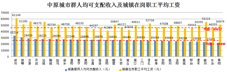 城市群人均城镇居民可支配收入均值为26448元,低于全国人均城镇居民可支配收入33616元;城市群中有16个城市高于城市群均值,分别为郑州、邯郸、南阳、聊城、许昌、新乡、焦作、菏泽、平顶山、信阳、开封、驻马店、运城、濮阳、济源、鹤壁。城市群城镇在岗职工平均工资的均值为48612元,超过均值的城市共有13个,分别为郑州、邯郸、驻马店、运城、周口、宿州、阜阳、三门峡、毫州、淮北、济源、漯河、鹤壁。