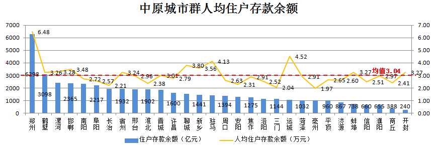 人均存款余额反映当地居民的财富水平,中原城市群整体人均住户存款余额为2.98万元,高于整体水平的城市有12个,分别为郑州、邯郸、聊城、新乡、蚌埠、开封、驻马店、运城、宿州、漯河、鹤壁、晋城。