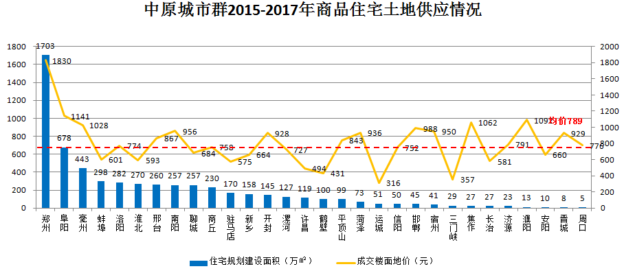 中原城市群26个城市2015-2017年三年平均土地出让住宅总建设面积为5996万平米,平均成交楼面均价为789元/㎡。
