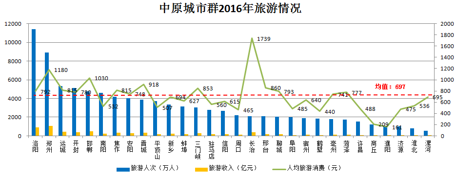 旅游反映了城市休闲配套资源情况和因旅游带来的短时流动人口流向。中原城市群2016年旅游人次达9.4711 亿人,旅游收入7344亿元;其中,洛阳、郑州、运城及邯郸为重要的旅游城市,四个市旅游人次占整个中原城市群的32.12%;中原城市群2016年人均旅游消费697元,超过整体水平的城市有14个,分别为郑州、开封、洛阳、安阳、焦作、三门峡、长治、晋城、运城、聊城、菏泽、毫州、邢台、邯郸。
