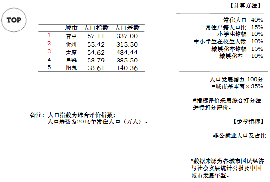 太原城市群城市基本面综合排名TOP3的城市为:太原、晋中、忻州。处在城市发展较好区、适中区、较弱区城市比例为0:1:4。