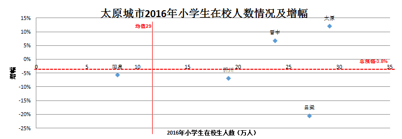 从小学生2016年在校生人数看,太原城市群2016年小学生在校人数为106.6万人,占全国小学生在校人数9913万人的1.07%;太原城市群5个城市小学生在校生人数总涨幅为-3.8%%;重点关注城市太原及晋中。