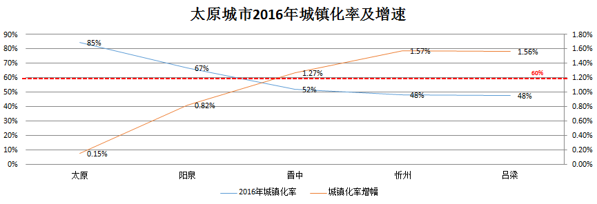 太原城市群5个城市城镇化率在60%以上的城市共2个,分别为太原及阳泉;5个城市2016年城镇化率增幅在0.15%—1.57%之间,平均城镇化率增幅为1.07%。太原因原有城镇化率水平较高,城镇化率增幅较小。