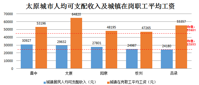 城市群人均城镇居民可支配收入均值为27653元,低于全国人均城镇居民可支配收入33616元;城市群中有3个城市高于城市群均值,分别为晋中、太原及阳泉。城市群城镇在岗职工平均工资的均值为53481元,超过均值的城市共有2个,分别为太原及吕梁。