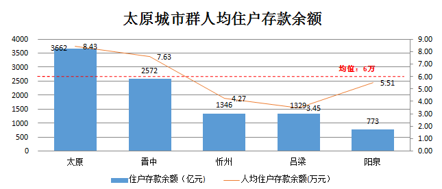 人均存款余额反映当地居民的财富水平,太原城市群整体人均住户存款余额为6万元,远高于其他城市群水平。高于整体水平的城市有2个,分别为太原及晋中。