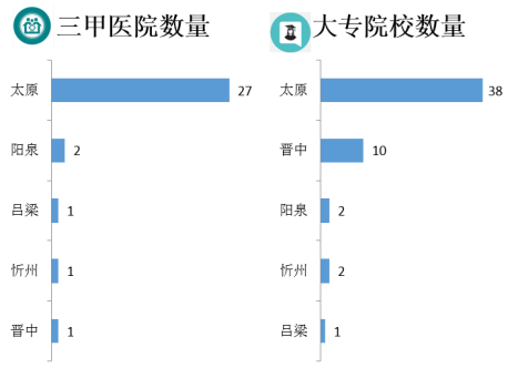 从最直接影响房地产的医疗教育配套来看,太原城市群整体配套相对较差,三甲医院共有32所,占全国三甲医院总数1599所的2%;太原城市群共有大专院校53所,占全国大专院校总数2631所的2%。