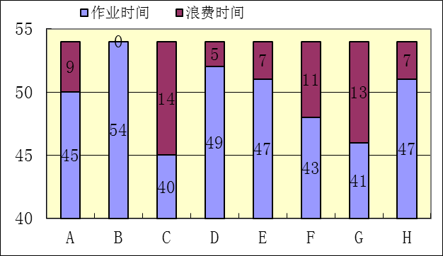 生产线的线速度为54秒,损耗时间共计66(9+0+14+5+7+11+13+7)秒,仅此一项就损耗15.3%(66/432)以上的生产效率。