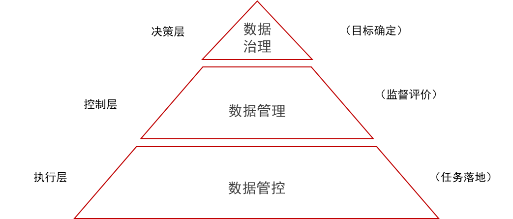 数据治理、数据管理、数据管控,三者形成一个数据活动的金字塔结构,数据治理在金字塔的最顶层,提供数据活动的总体工作方案和规划。