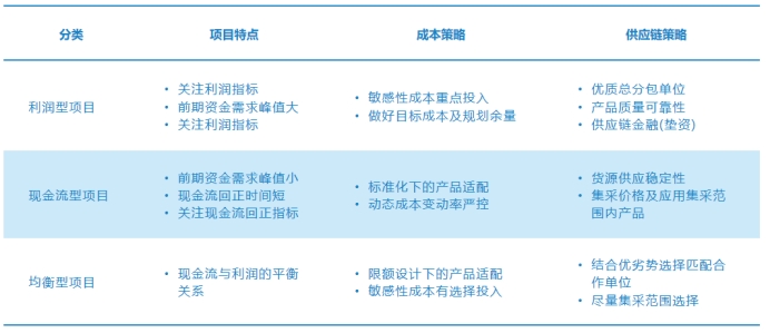 同样如此,每一个产品都有其明确的定位。我们把项目类型从经营视角分为利润型项目、现金流型项目、均衡型项目。要保证每一个项目的成功,供应链的策略就必须针对性构建并形成差异化。
