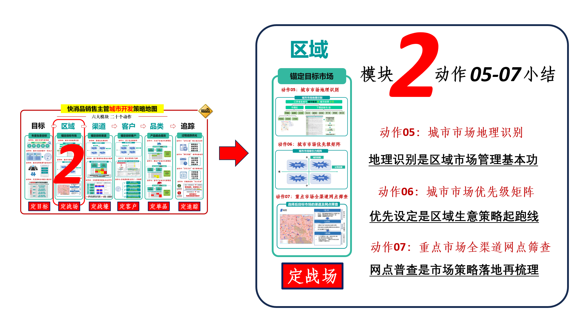 “快消品销售主管城市开发策略”六大模块的第二模块关于区域“定战场”的相关三个动作阐述到此,让我们跟着老王的本模块总结来回顾一下这个模块的主要内容知识点。如图3-9所示。