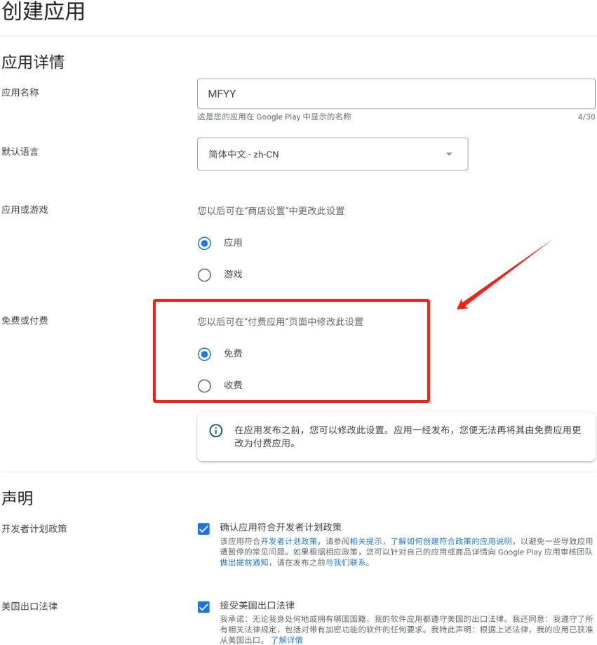 在Google Play管理中心创建应用时,需要填写基本信息,并选择应用的盈利模式,可以是“免费”或“收费”(如下图所示)。如果选择收费模式,开发者需额外提供商家收款信息,具体要求可参考官方说明。对于免费模式,流程会相对简单,不需要额外的财务信息。