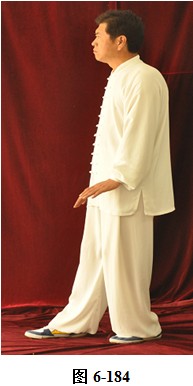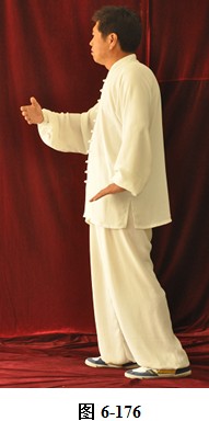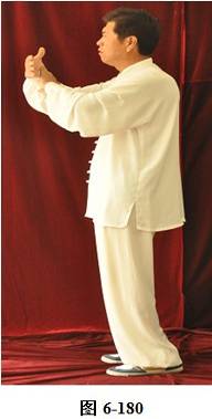 注意:身体左右转动时,要以腰为轴,内劲带动,身体保持中正、松肩、松胯、松膝。这套拳自始至终对身形的要求都是一致的, 动作要柔缓,速度要均匀,手脚的动作配合更要协调一致。弓步时小腿要垂直,膝盖以不超过脚趾与脚掌相连的指节为宜。