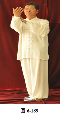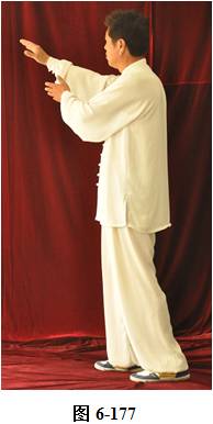 掤:右腰上提,右脚向前迈步,重心渐渐移至中间,成右弓步; 腰继续上提,右小臂同时向右上前方打掤,右掤手高与膻中穴平。左手掌心向下置于左胯旁,意念领腰继续上提,右手随之向右上撩掤,左掌跟随向上,当掤至略高于肩时,两掌翻转掌心斜相对(见图6-174至6-189)。